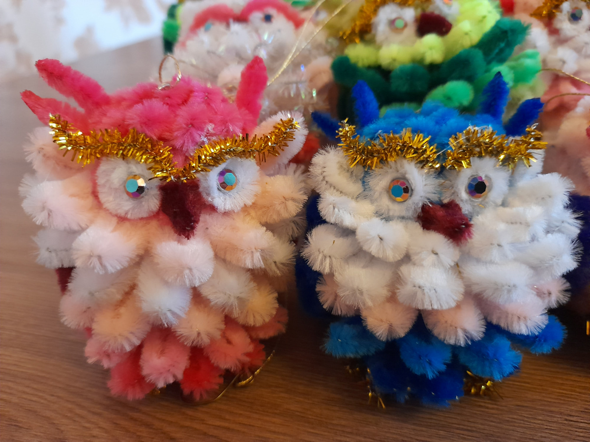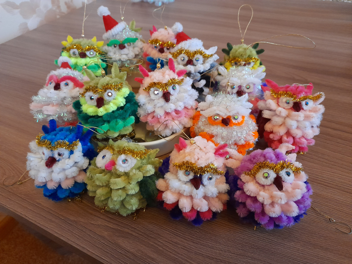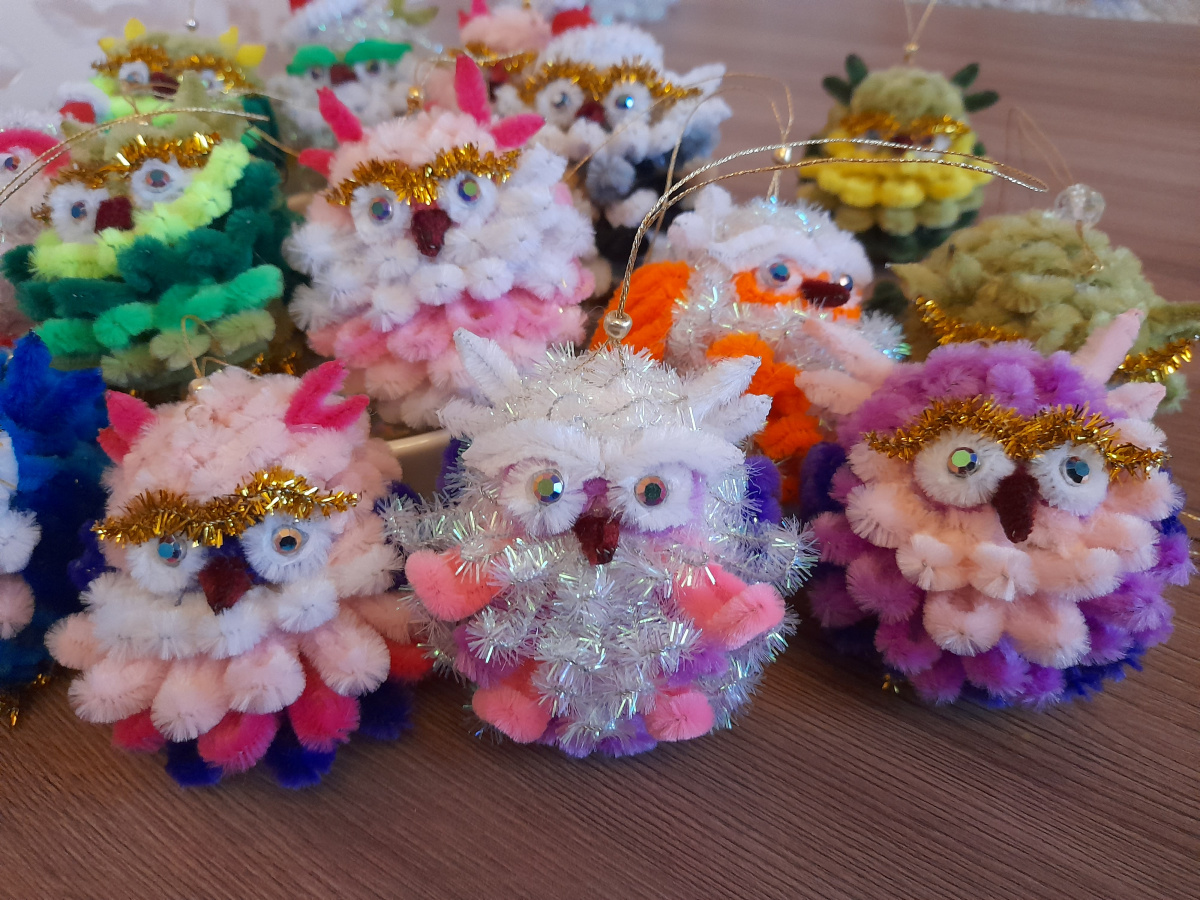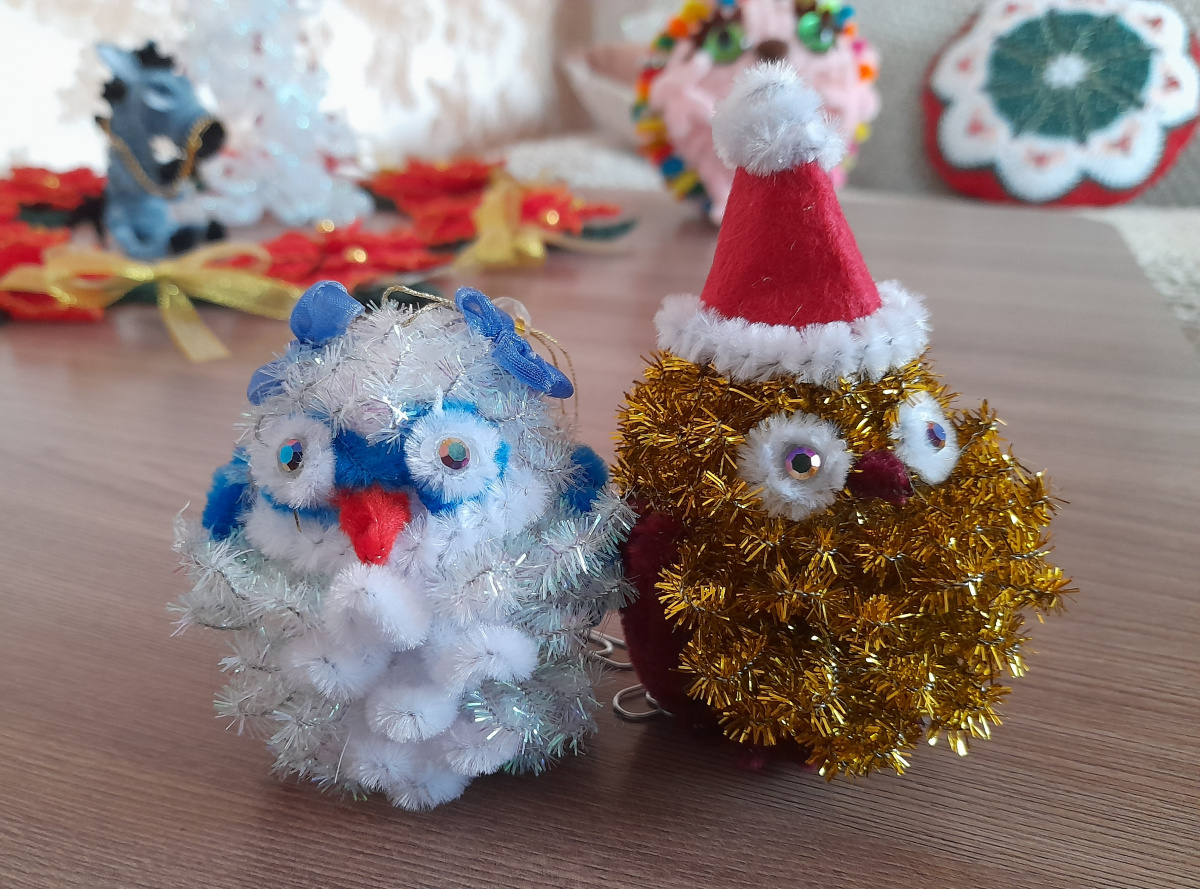 Не ожидала, что синельная проволока настолько меня увлечет. Навертела из нее кучу новогодних украшений, но особенно понравилось делать совят. Если что-то подойдет на елочку, буду очень рада.