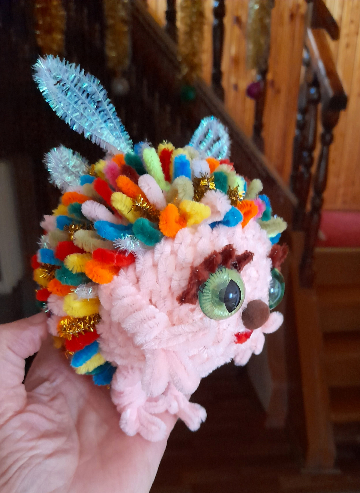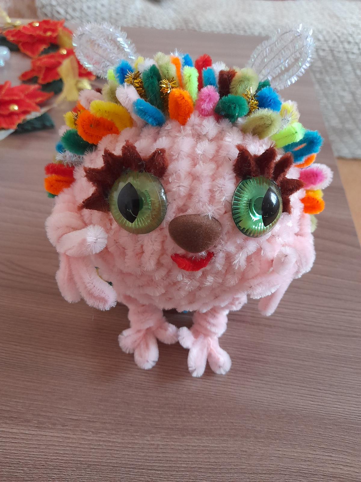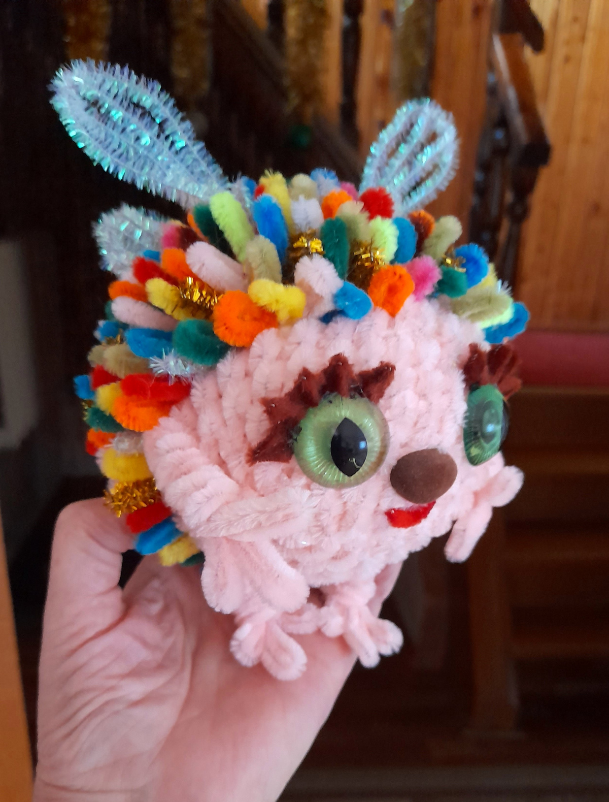 Сделала кучу новогодних штучек из синельной проволоки, остались обрезки и я решила сделать какого-нибудь зверя. Долго не могла понять, кто это, а когда сделала крылышки, стало ясно, это — Моль!!! Веселая и наглая моль, которая съела много цветных кофточек и шапочек!