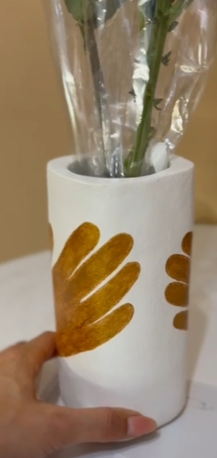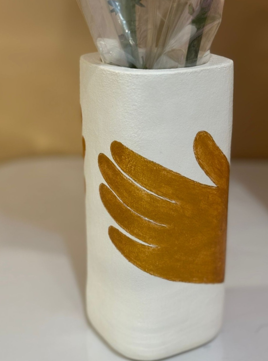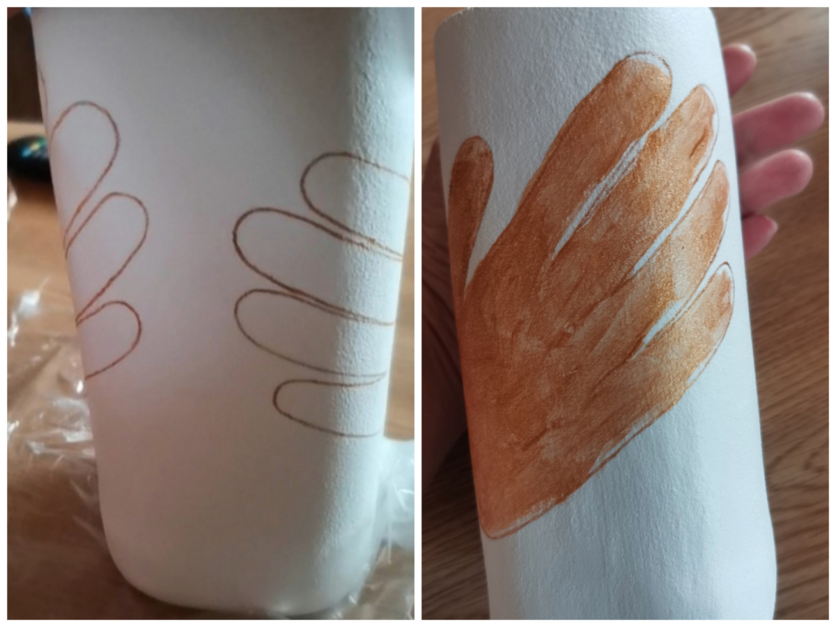 Пришла идея срисовать ладошки внучки и перенести на вазу-будто её руки держат