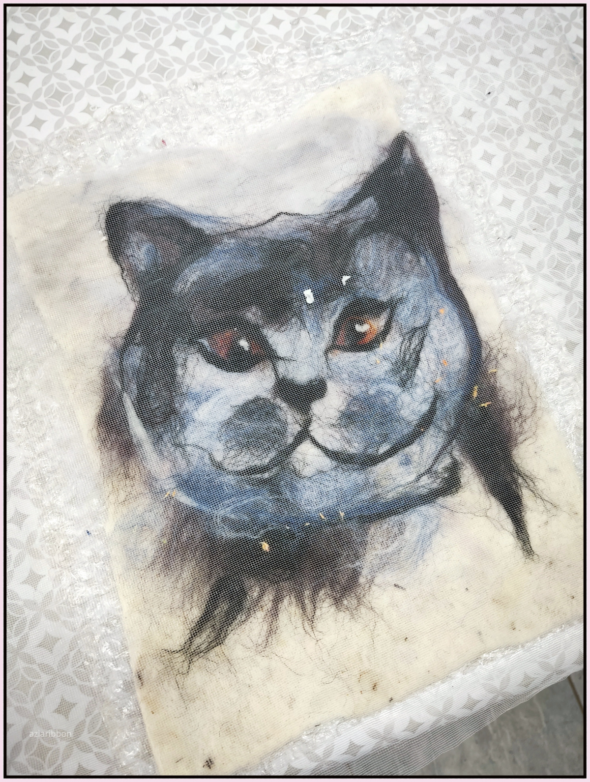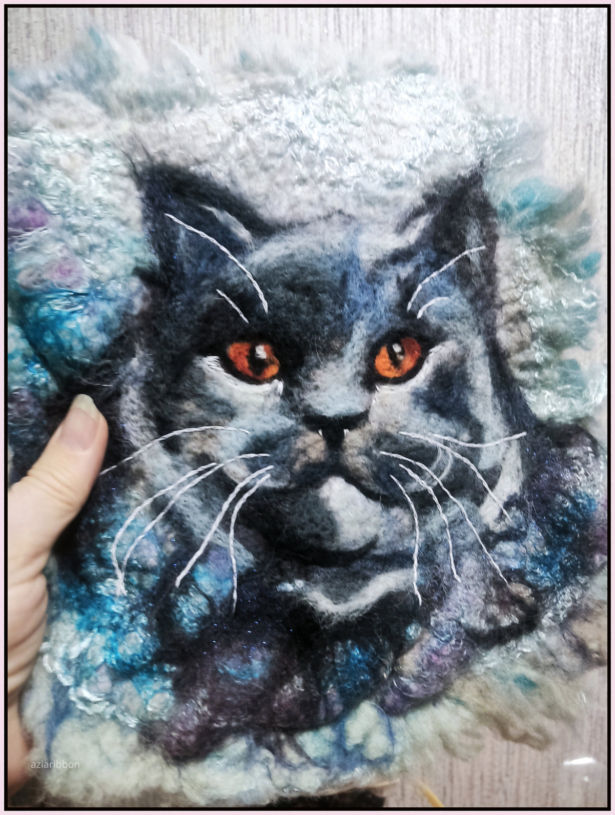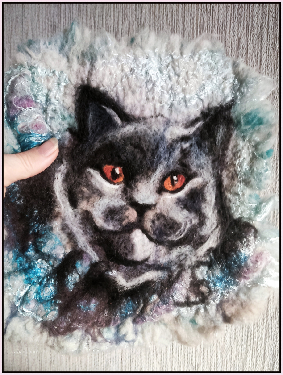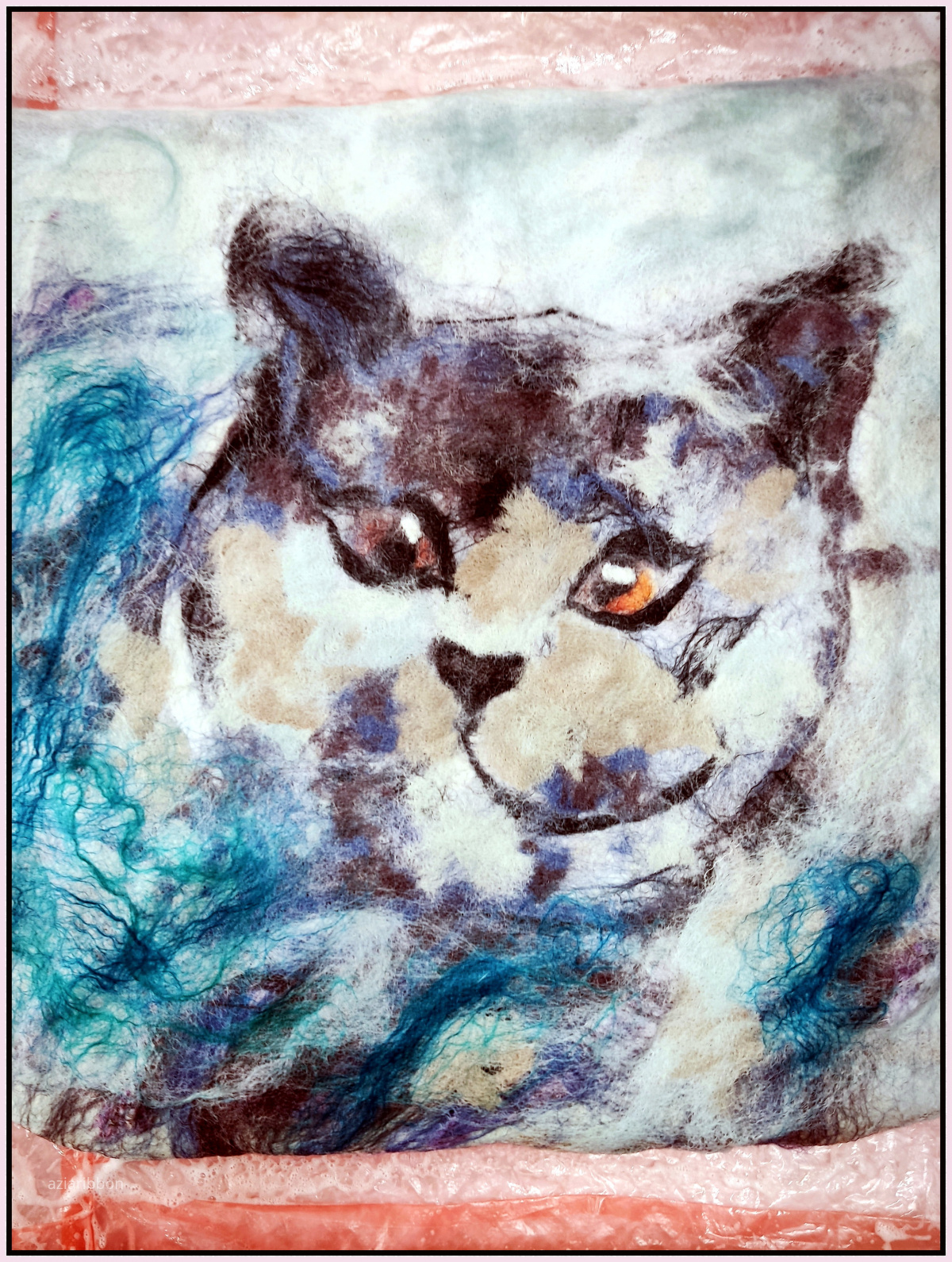 А преподавательницу предупредили о визите корреспондентов. И группа должна быть вся в работе! Ну, я и взяла мешочек с остатками шерсти, которые с прошлого раза оставила в студии. Набора расцветочек и количество были небогатые… Ну хоть что-то! И надо было быстренько что-то изобразить. А что я могу даже с закрытыми глазами набросать? Только кота)))