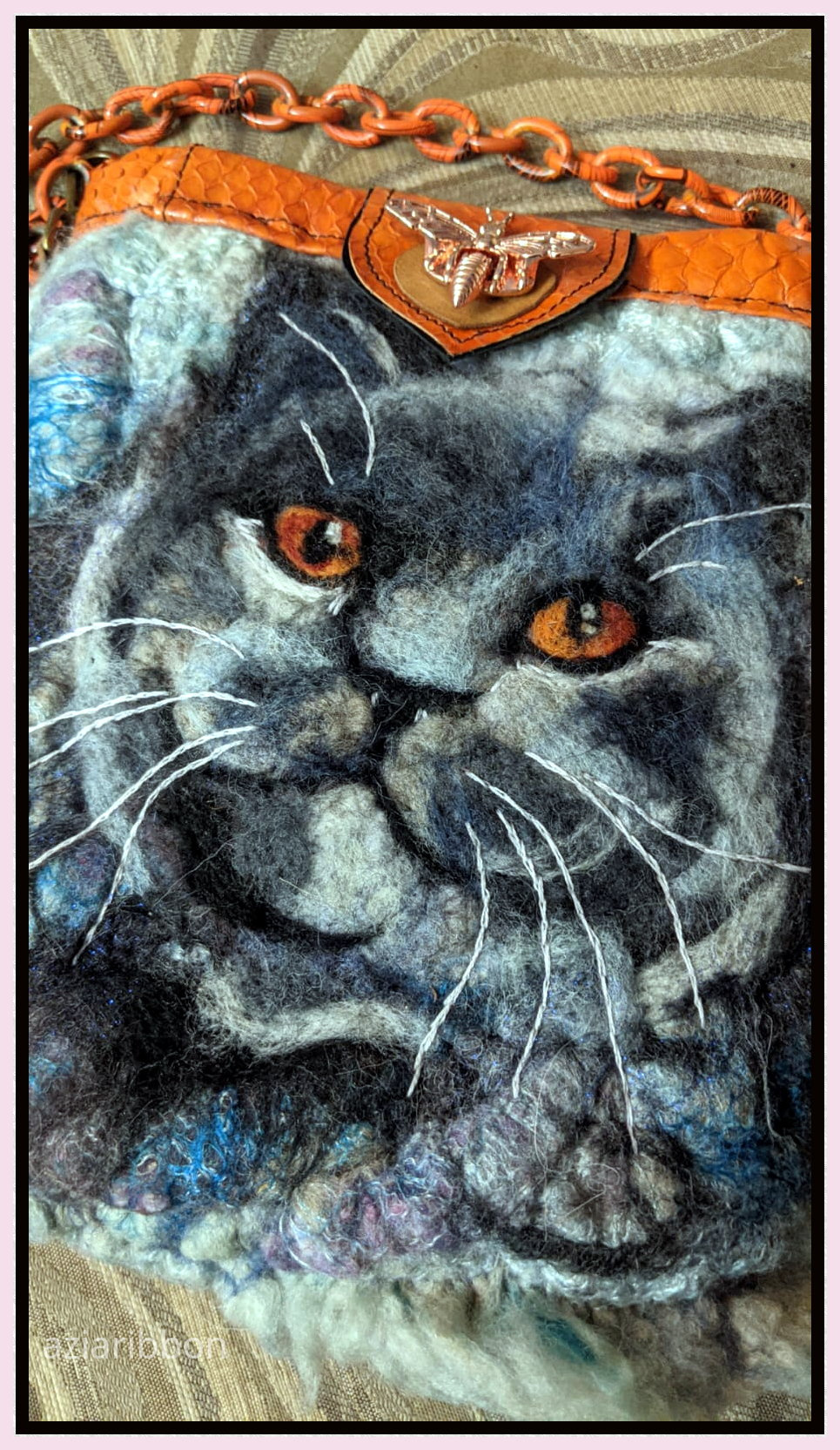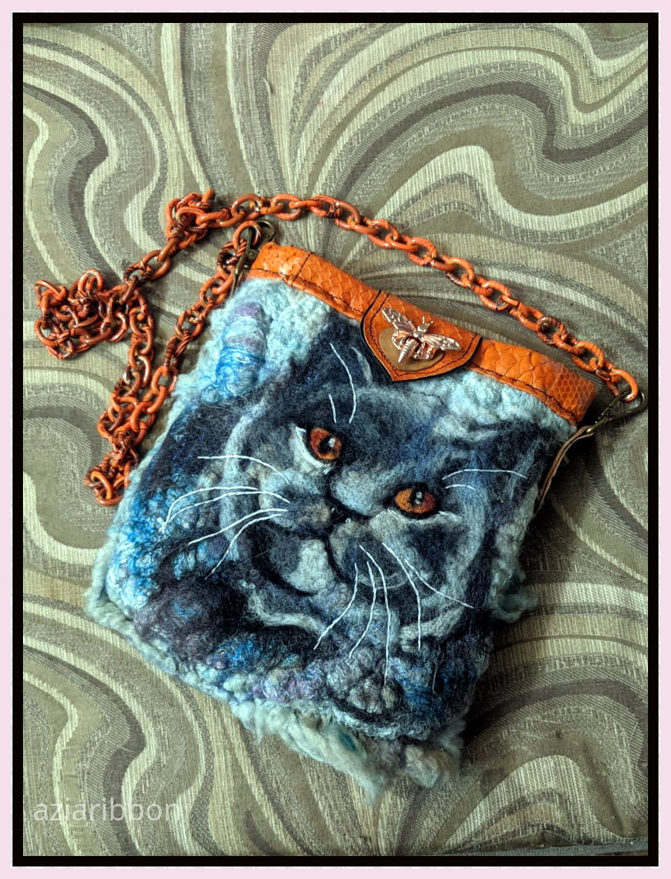 Я долго думу думала. Потом решила идти по пути наименьшего сопротивления, свалять отдельно сумочку и тупо пришить к ней кота))) Так и сделала!