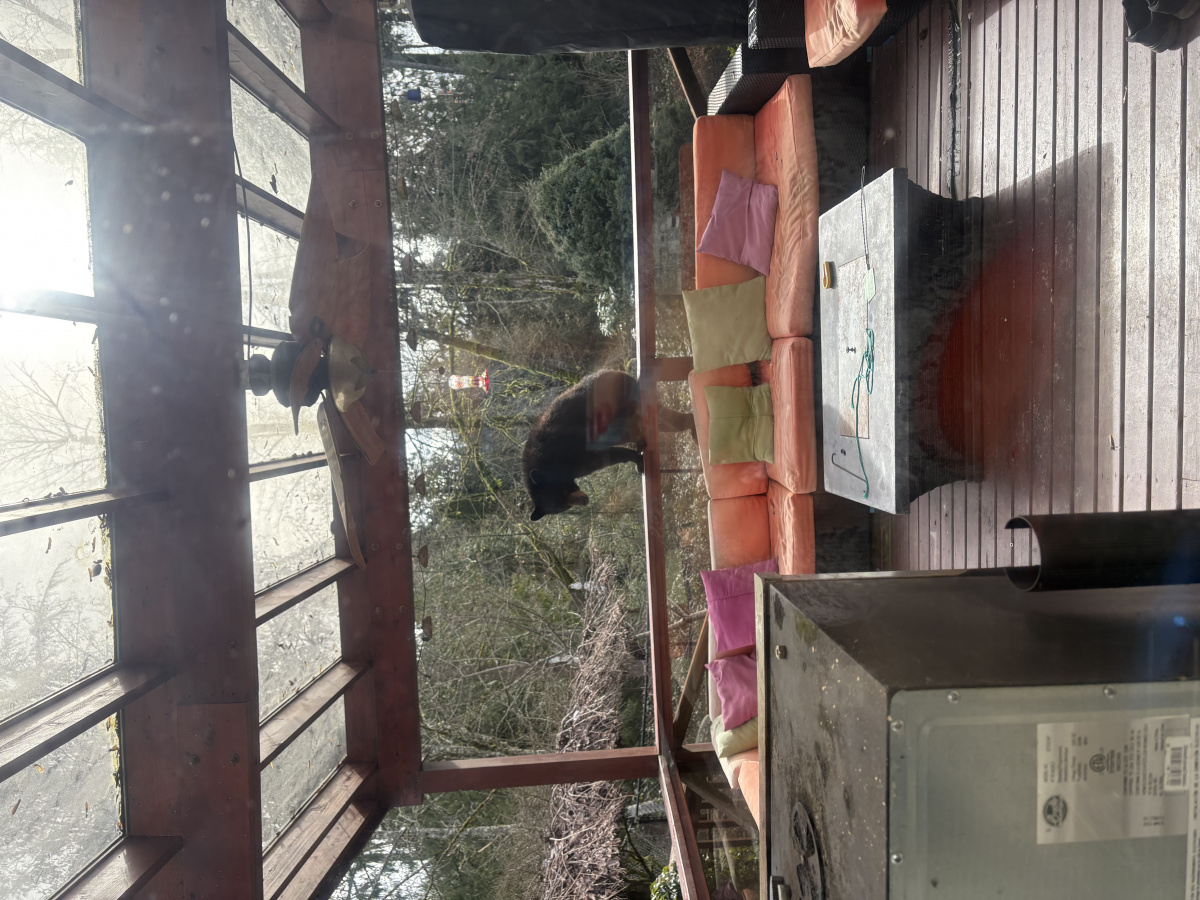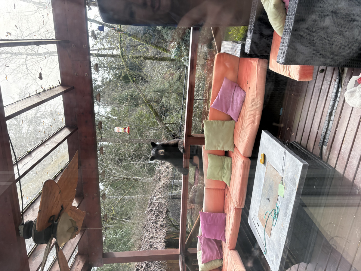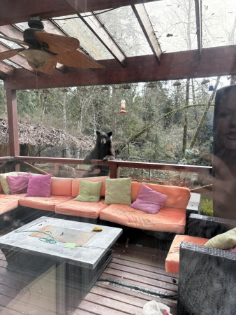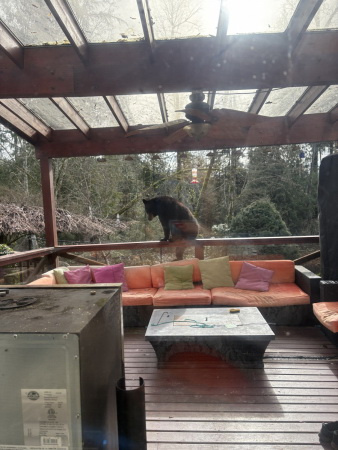 Кори (муж дочери), что-то делал во дворе, а мама медведица (весит до 300кг) стояла на заборе из рабицы, а два медвежонка сидели под яблоней и наслаждались яблоками. Это осенью они часто приходят.Мишкам в доме не интересно, там две громких чихуахуа и два больших кота охраняют.