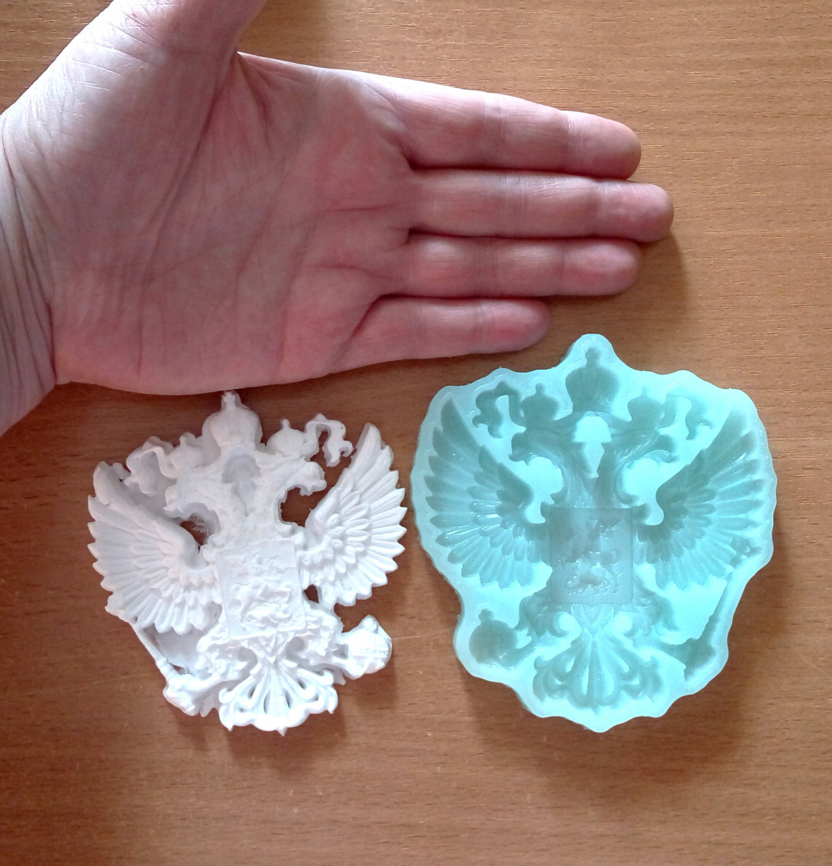 Если вдруг кто тоже ищет, размеры 10х9, очень детализированный. Вот ссылка на ОЗОНе — Молд Герб России.