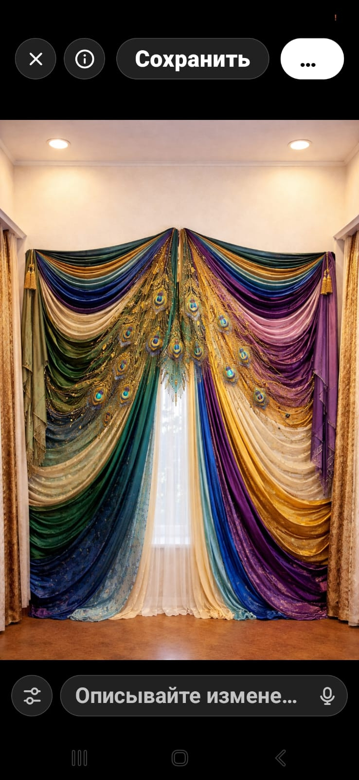 Представления не имею, как павлин впишется, потому что меня этот момент уже не особо волнует) Меня попросили сделать, я сделала. В понедельник отнесу и отдам. А как там будут в магазине городушки городить, какие ткани и куда вешать, как павлина прикреплять — не моя проблема)))