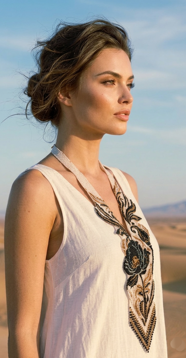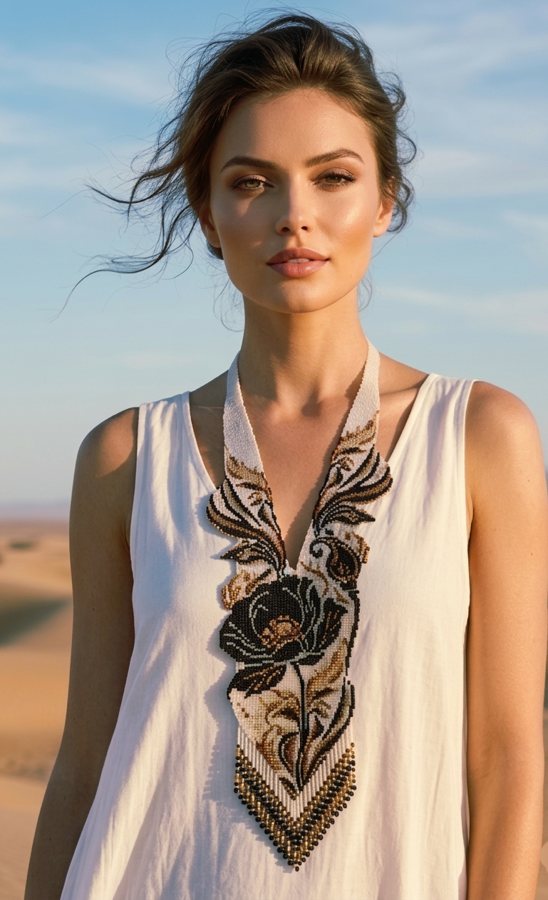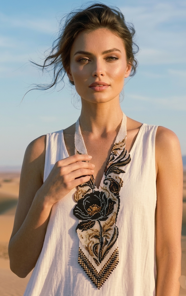 Каждая деталь этого колье пронизана духом пустыни. Переплетающиеся узоры в золотистых и коричневых тонах напоминают о изгибах барханов и танце ветра. А сверкающие бусины, словно капли росы на утреннем солнце, придают украшению особый шарм.