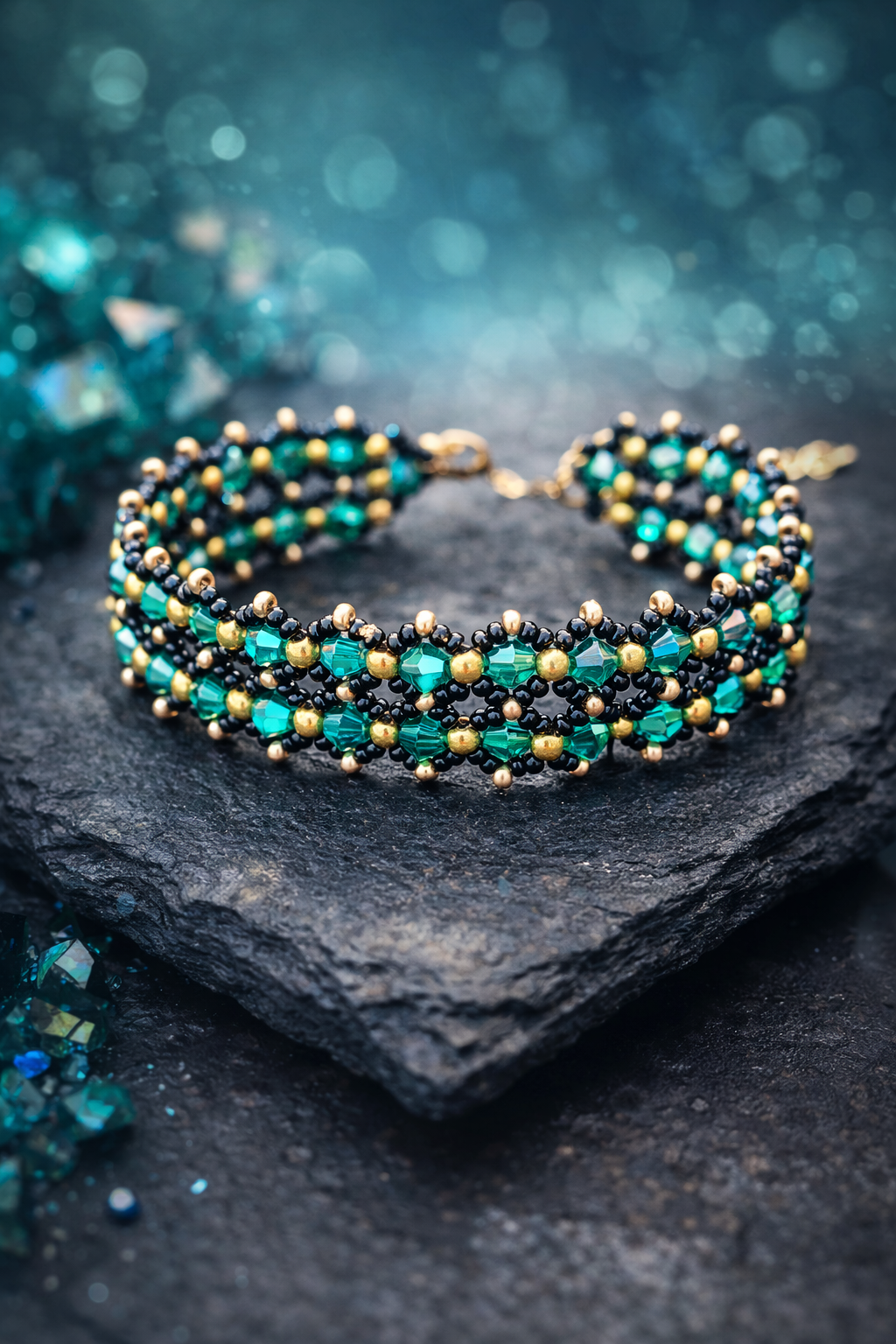 Этот изысканный браслет ручной работы, выполненный в технике плетения, напоминает драгоценное кружево. Глубокие переливы изумрудных кристаллов в сочетании с золотистыми акцентами создают образ, полный благородства и таинственности.