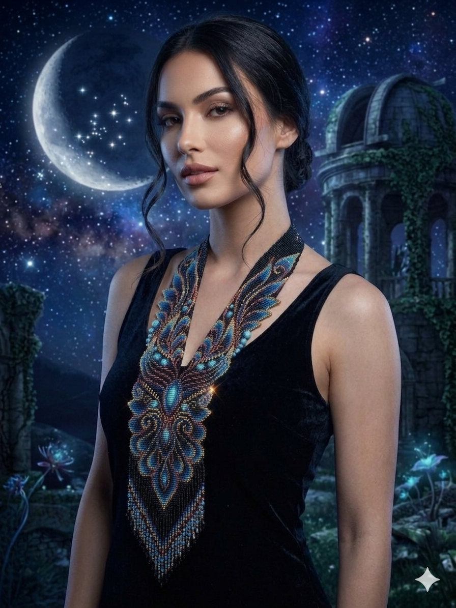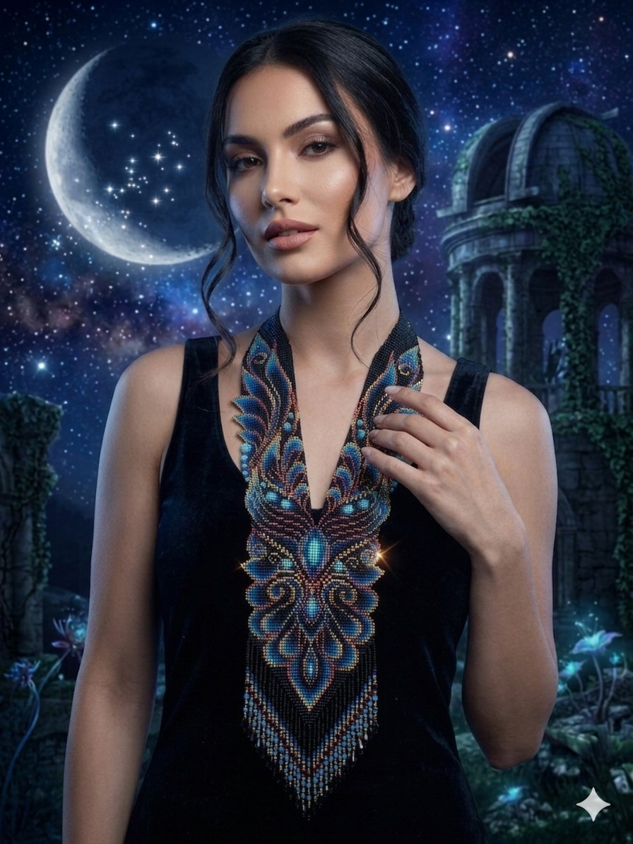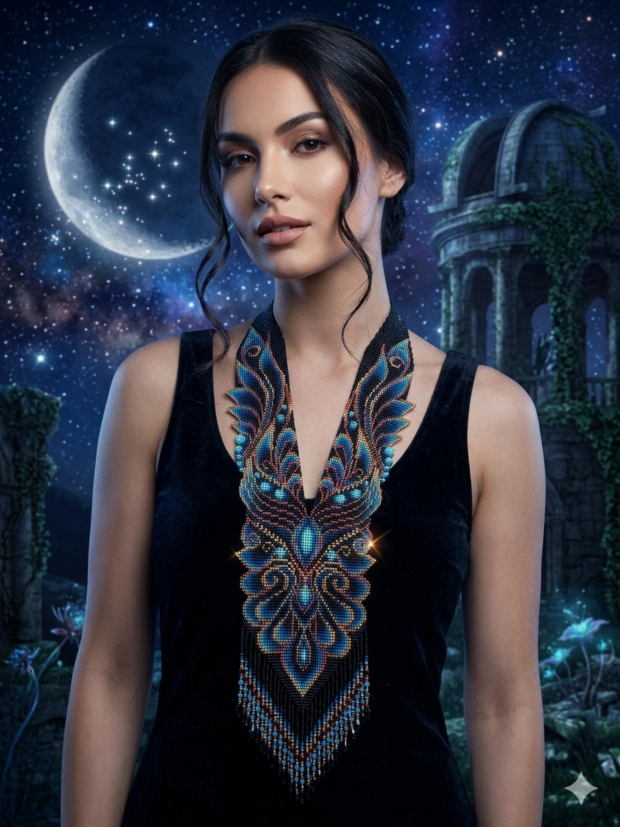 Это величественное украшение ручной работы кажется сотканным из самой ночной прохлады и мерцания далеких звезд. Глубокие синие, бирюзовые и золотистые оттенки бисера складываются в сложный орнамент, напоминающий крылья мифической птицы или экзотической бабочки. Колье идеально дополняет вечерний образ, превращая его в сакральный наряд современной богини под покровительством луны.