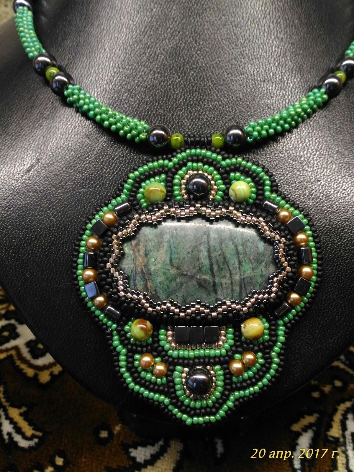 вышитый кулон с камушком лиственита (подарок по игре от KateKostina ) камень такой красивый, рисунок напоминает стволы деревьев в лесу. В вышивке использован гематит и жемчуг.