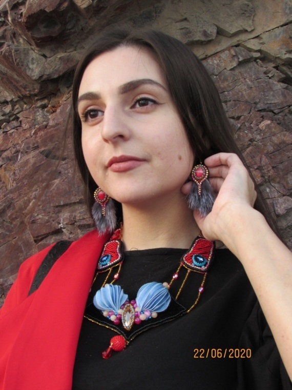 Сережки симпатичные и колье интересное. Украшение на голову тоже притягивает внимание. Удачи в конкурсе! Модель — красавица!