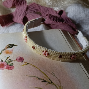 Расшито по основе из хлопкового шнура тошкой, отделка бусины коралла и авантюрина. Изнанка тканевая. Завязки -ленты....