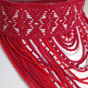 Поджерелки… Подобные украшения делались и носились в 19 в… Низание, закреплённое на ленту основу, у ленты есть изнанка из хб ткани, застёгивается на пуговку.