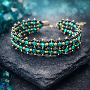 Этот изысканный браслет ручной работы, выполненный в технике плетения, напоминает драгоценное кружево. Глубокие переливы изумрудных кристаллов в сочетании с золотистыми акцентами создают образ, полный...