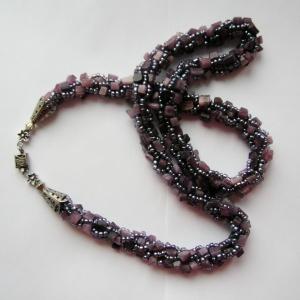 Колье сплетено по двум МК hellenca — «Morticia Addams» и «Chefchaouen». Мастер-классы Лены тем и хороши, что элементы можно комбинировать. Еще раз огромное ей спасибо! В центральном элементе — горный хрусталь, в остальных кристаллы...