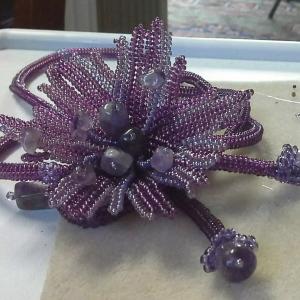 Очень мне хотелось ндебеле лилию «растрепку». Из чеха 10 немного громоздко для броши к шарфику получилось. (В идеале нужно бы пятнашку, но не для моих глаз и рук, увы) А раз такое дело, утяжелила еще бусинами аметиста, очень красивыми....