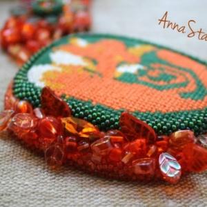 Вышила когда-то лисичку и никак не могла ее пристроить. Потом решила начать ее делать на авось, что получится. Получилось колье) Длина — 47 см.