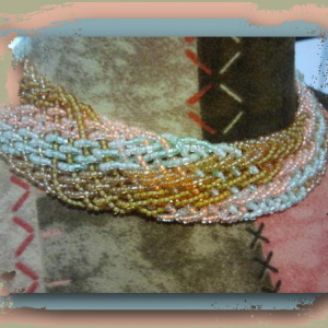 Сплела браслет. Сфотографировала, отправила фотки 25 марта заказчице. Она одобрила. Я начала плести колье в комплект к этому браслету. Но не смогла.