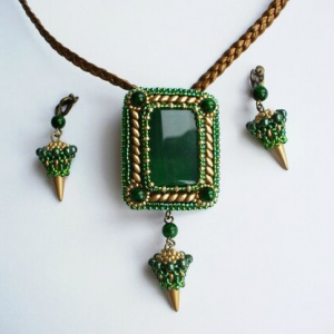 Сделана в 2014 году. Камень был куплен как нефрит, но я не уверена, что это правда. Брошь превращается в кулон с помощию идеи NATYY Плетенный съемный переходник
