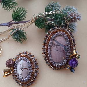 изначально планировался кулон-галстук с двумя этими яшмами, но потом подумали и решили, что кулон и брошь можно и вместе и по отдельности носить, сделала два изделия, это подарок на новый год будет