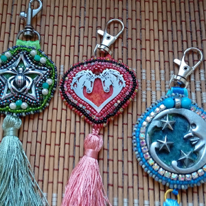 Три подарочных брелочка, основы-металлические кулоны-амулеты,«Паук», Месяц" и «Лошадки», потихоньку к НГ готовлюсь(все-таки фото не передает сверкание стразовой ленты, вообще, а она там имеется)