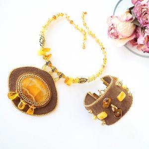 Ей так понравились, что она заказала своей подруге комплект на коже с янтарём, большого кабошона для кулона у меня не было, я использовала медовый симбирцит, он очень похож с янтарём на мой...