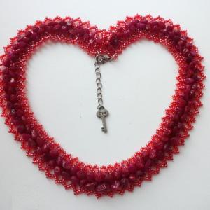 Колье сделано в виде бисерной сетки и расшито хрустальными бусинками и крупным бисером.