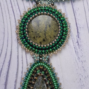 Очередная переделка старого колье. Все сложилось и сплелось на одном дыхании. Все камушки из старых запасов, нефрит, змеевик, а вот последний оказался не подписан. Девочки, кто знает название, подскажите.