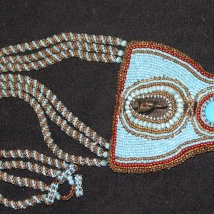 Довольно давняя работа из этнографической серии. Делалось по образцу жреческих украшений древнего Египта. Вышитая подвеска на мозаичных жгутах, имитирующих толстые металлические цепочки с перемычками из фрагментов квадратного...