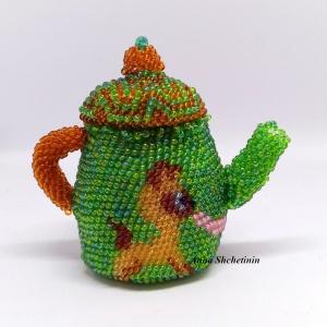 Бисерный чайник связала на День Рожденья сына моей подруги (просил «что-нибудь с котиком»).