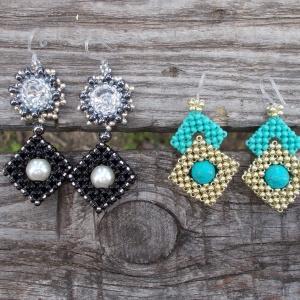 Сначала пробовала оплести риволи одним размером бисера (10-й чешской), сделала сережки с квадратной бусиной. Ушли в подарок.