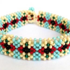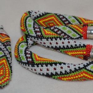 Давно связано. Захотелось геометрическое и яркое. Шнур средней длины и браслет. Застежка есть, нет фото. Чех 10-ка. на 20 бисерин. не толстый, средний такой.
