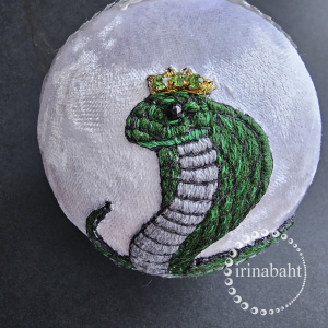 Подруга родилась в год змеи, Отправила на подарок к новому году. Сделала 2 шара, диаметр 8 см. Внутри пластмассовые половинки обтянуты бархатом, склеены клеевым пистолетом. Вышивка пришита сверху.