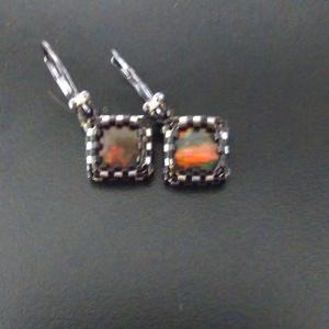 Познавательный флешмоб однако . Аммолит — это окаменелый перламутр, водится в Канаде. Красивый, зараза, но дороговато получается. Нашла по сходной цене пару на сережки и необычный двусторонний квадратик на кулон. Вот что получилось...