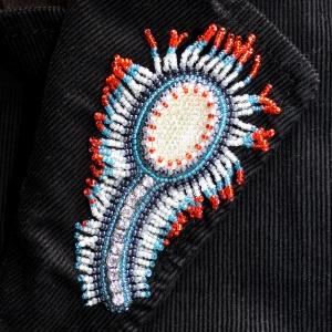 Кулон вышит мелким японским бисером (в том числе с устойчивым гальваническим покрытием) и канителью. Подвешен на жгут из японского и чешского бисера. Жгут можно носить как с кулоном, так и без.