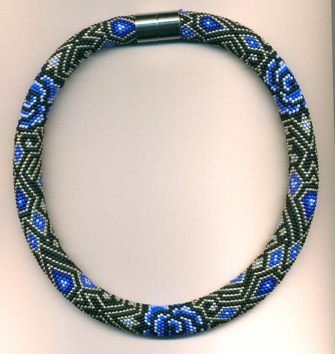 Жгут из японского бисера Toho 11 (черный и серебристый) и чешского бисера 10 (три оттенка синего) по схеме Альбины Тезиной «Эльфийская песнь о Розе».