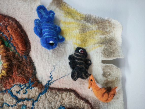 Предполагалось, что каждый сваляет префельт определенной цветовой гаммы. Префельт — это недовалянный войлок, который можно вырезать нужной формы и размера, совмещать, как мозаику, дополнять рельефом, а потом всё вместе уже доваливать до нужной кондиции. Для этого и нужна была команда. То есть один сделал бы лист префельта в зеленых тонах от темного к светлому, другой — в коричневых, третий — в песочных и т.д. Кто-то один свалял бы большое полотно-основу, можно даже бюджетно на марле)