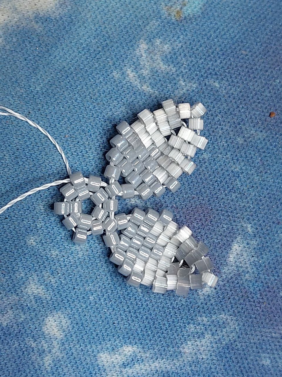Потом к бисеринкам внешнего круга приплетаются петельки лепестков из 14 бисеринок. Можно все сразу, а потом уже доплетать лепесток на каждой петельке. Я приплетала по очереди. У меня 4 глянца-6 сатина-4 глянца. Замыкается в петельку на этой же круговой бисеринке. И по этой петельке плетется обычной мозаикой нужное количество рядов. На перегибе ндебелька. Дырка зашивается двумя глянцевыми бисеринками. Я это делала после проплетания второго ряда. Можно и в конце, но мне так удобней показалось.
