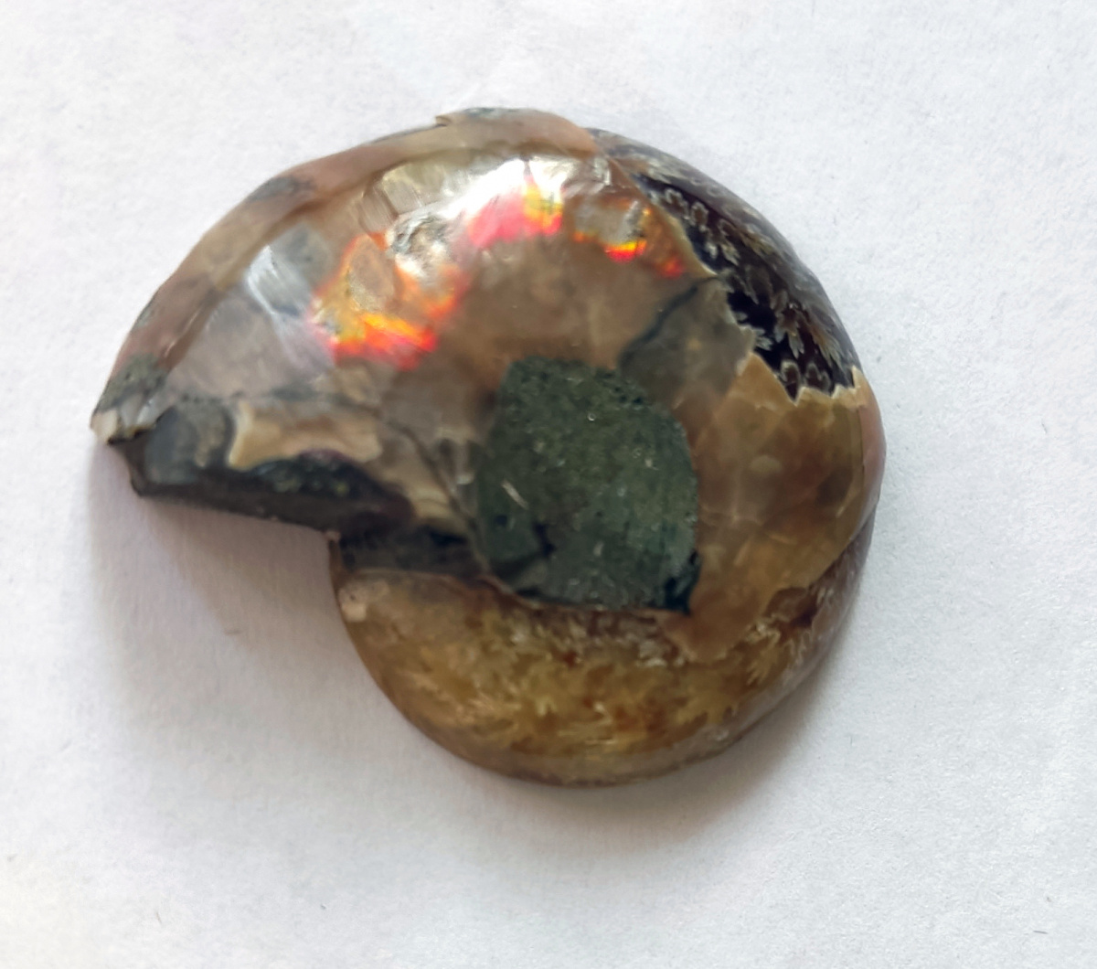 А «листья», это не отпечатки растений. Такие «листики» просматриваются в симбирцитах, аммолитах и аммонитах, я думаю, что это отпечатки структуры самого аммонита. Вот у меня есть амммонит маленький, там тоже видны эти листья, как на темной, так и на светлой части и они просвечиваются изнутри.