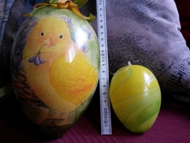 Написала выше, что у нас есть любые яйца, а вот фиг! Поехала покупать и услышала, что вчера продали последнее! Правда, заказали новые и через пару дней ждут. Но будут только пластиковые и полиуретановые. А деревянные надо заказывать отдельно да и то — самое большое 6 см. Меня такой мелкий размер не очень вдохновил. Пошла смотреть по дешевым магазинчикам — ну должны же они готовиться к празднику! Нашла какие-то небольшие, на всякий случай измерила — и оказалось самое то: 8,5 на 21 см. Честно говоря, я их представляла немного крупнее, но попробую на этих. А теперь я вас немного развлеку — это фото этого яйца (справа) рядом с крупным (в моем понимании!) яйцом, которое я делала до увлечения бисером в технике салфеточного декупажа