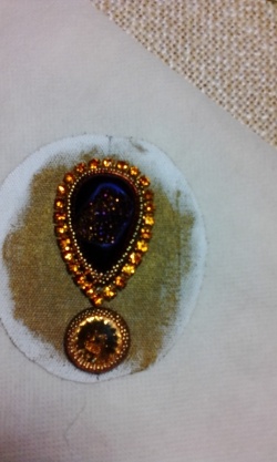 Второй вариант: друза агата с титановым покрытием, к нему сваровски 14 мм «Golden Shadow», миюки 15 золотой с золотым блеском на обшивку риволи и камня, бронзовый на фон, золотой гальванизированный на листики, плюс стразовая лента. Приложила, вроде всё сочетается. Нитки, иглы, кожа, клей, кастрюлька — всё есть, швензы, бейлы, пины, колечки, всё делаю собственноручно из серебра, т.к. основная профессия — ювелир, работаю в ювелирном цехе.