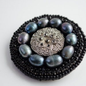 Брошь — кругляш. Винтажная стеклянная пуговица в обрамлении жемчуга.