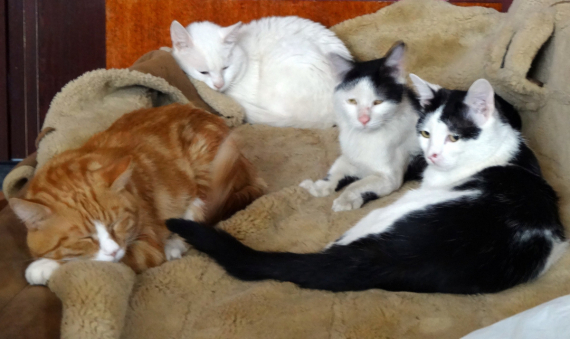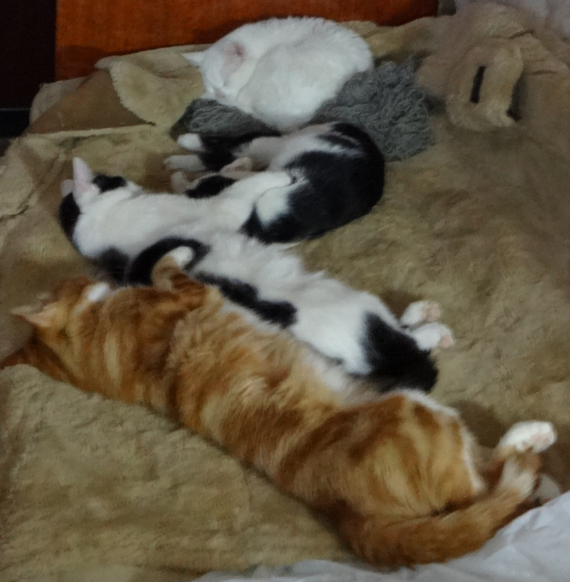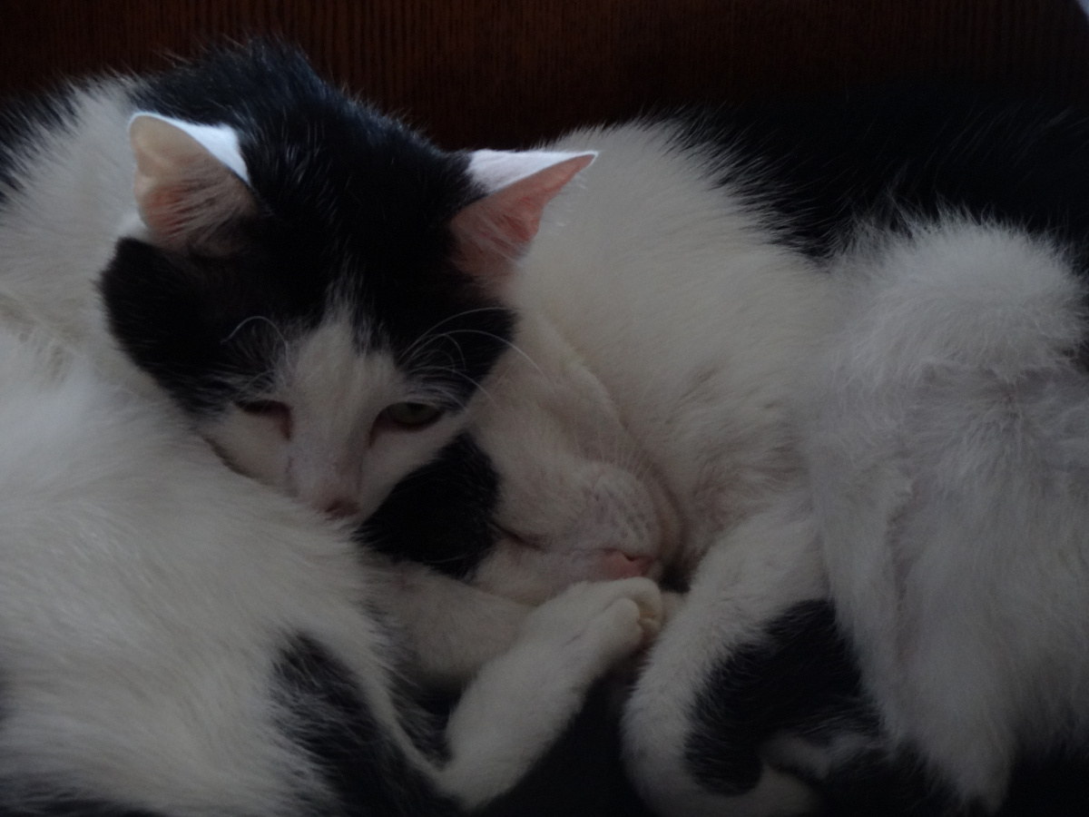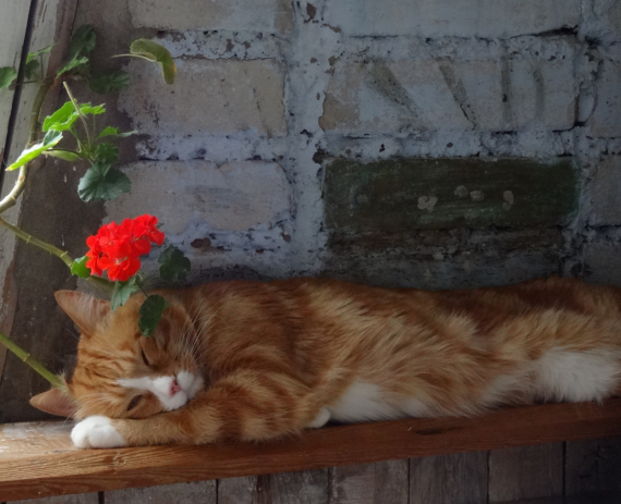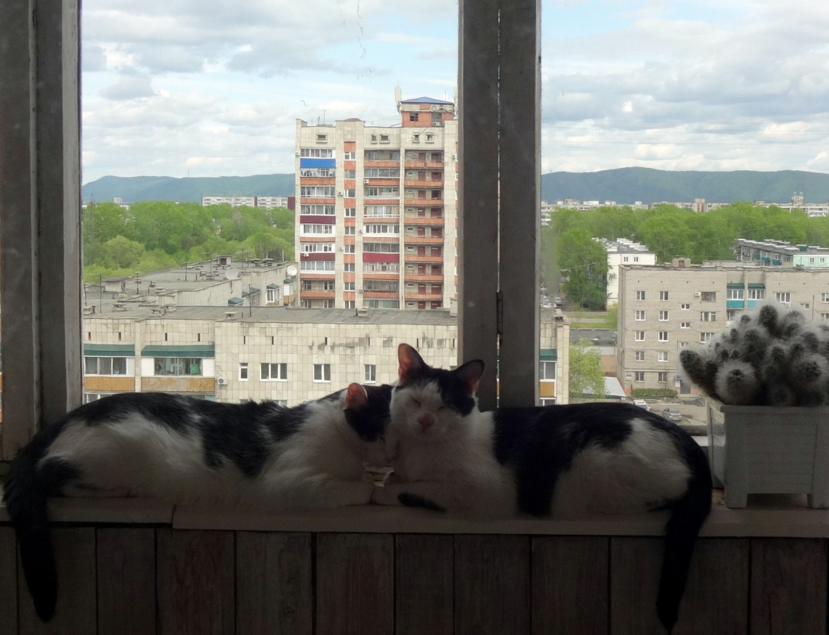 А у меня было 2 кота — белый Федя и рыжий Стёпка. Но 2 года назад забрала с завода ещё одного кота, а потом и ещё одного, чтобы их там не отравили. Там хорошие люди работают, разбирали котят по домам или пристраивали в зооспас. Назвала их Яшка и Пашка. Они братья. Сейчас в голову пришло — одни инвалиды в доме))) рыжий Стёпка — подобрыш с подъезда. Забрала его домой временно, а потом жалко стало отдавать, потому что они с Федькой очень подружились. У него одно лёгкое — грыжа диафрагмы. В клинике сказали, что скорей всего кто-то пнул и с такой травмой живут максимум полгода, а он у меня уже 9-й год живёт)) думаю, что его Федька вылечил, он месил ему живот и вылизывал как котёнка)) Яшка — с дыркой на носопырке и кривым когтем на одной лапке. Рассказали мне его историю — котёнком убегал от собаки и прыгнул в пустую ванну из-под кислоты и, видимо, тюкнулся носом туда, где осталась к-та, а собака лапы обожгла. А у Пашки кончик хвоста обломан и присох, как закорючка) про него ничего не знаю. Белый Федя умер год назад, прожил со мной с котячьего возраста 20 лет. это Яшка, когда его принесла домой с работы. Худой был, грязный и слабый, а глистов сколько было...но теперь оба толстые, счастливые и уже не устраивают бесиво по утрам. А поначалу будили меня на рассвете своими скачками, наверное, так радовались новой безопасной обстановке))) хотя, они и на работе бесились, шары от ёлки потом по всему цеху собирали))))не пугайтесь бардака на балконе — это ещё до ремонта. Новых фоток пока нет, чтобы показать, какие они теперь сытые и довольные)) позже сделаю.