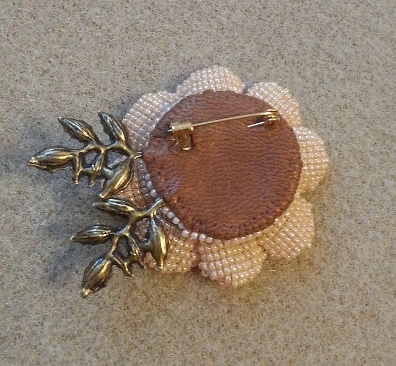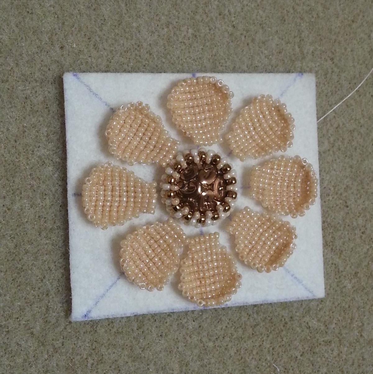 Поскольку 15-шка у меня Миюки, лепестки получились немного меньше по ширине и, чтобы местами не проглядывала основа и можно было поставить хотя бы маленькую булавку, делала два ряда обшивки бисером с изнанки: первый ряд шила пятнашкой, второй — немного более крупным чехом. Результат понравился, чех дополнительно поддерживает лепестки.