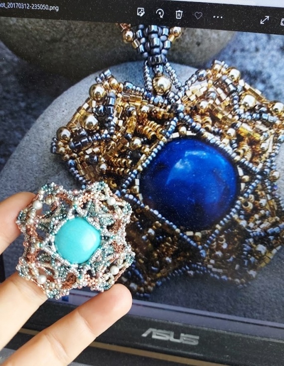 Это второе приближение, но отличий от оригинала ещё много, кое-что не удалось сделать, не туда шестигранные верхние усики закрепила, а резать не захотела. Остался ещё 3ий бирюзовый кабошон, вот только не знаю, захочу ли в ближайшее время возиться, 5 лет собиралась, могу ещё 5 лет прособираться