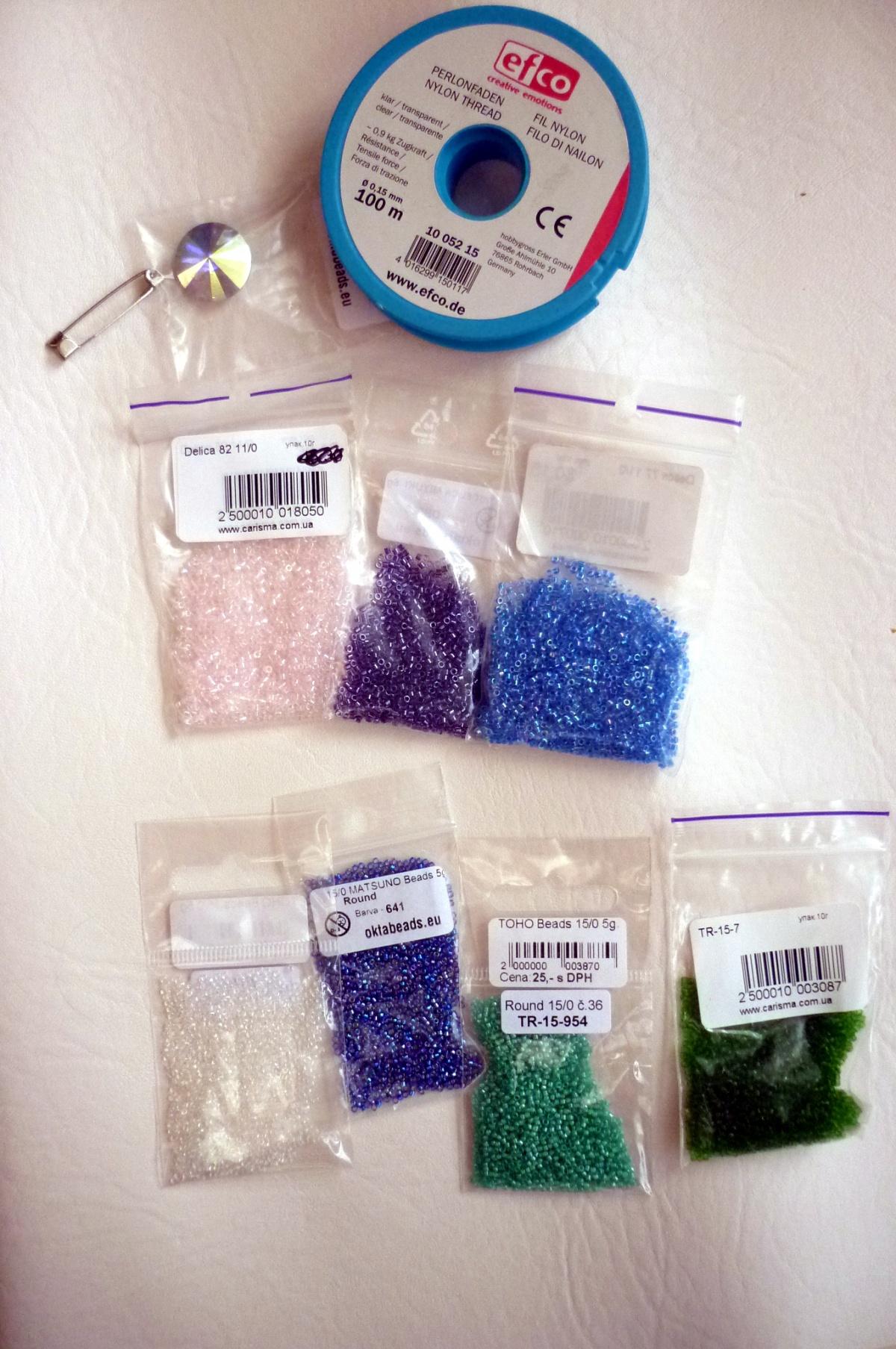 Бусины, конечно, тоже есть. Буду подбирать их по ходу дела. В верхнем ряду делика, в нижнем — Тохо 15. Цвета, возможно тоже немного изменю, но пока так