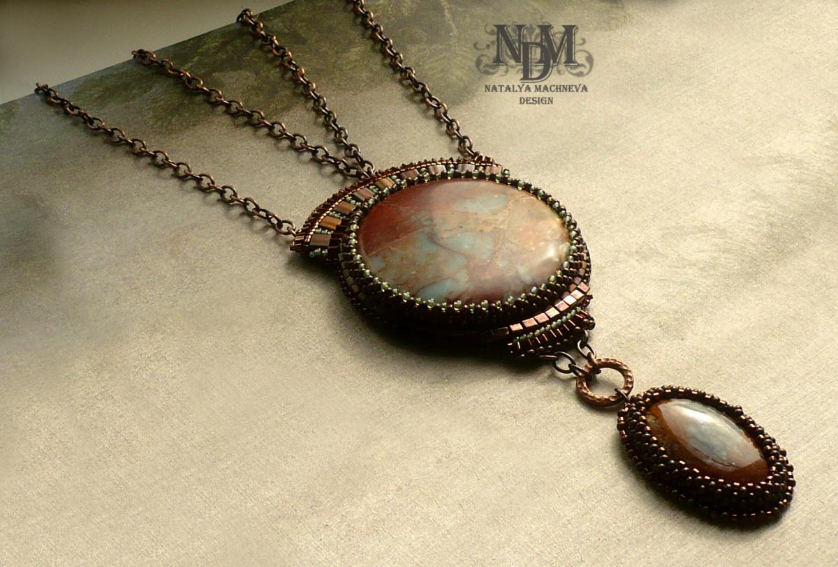 Этно-кулон с натуральными камнями «географической» окраски — это яшма и липарит. Фурнитура цвета античная медь отлично подошла к камням. Кулон будто бы найден на раскопках древней цивилизации или получен в дар в экспедиции в новые неизведанные земли.
