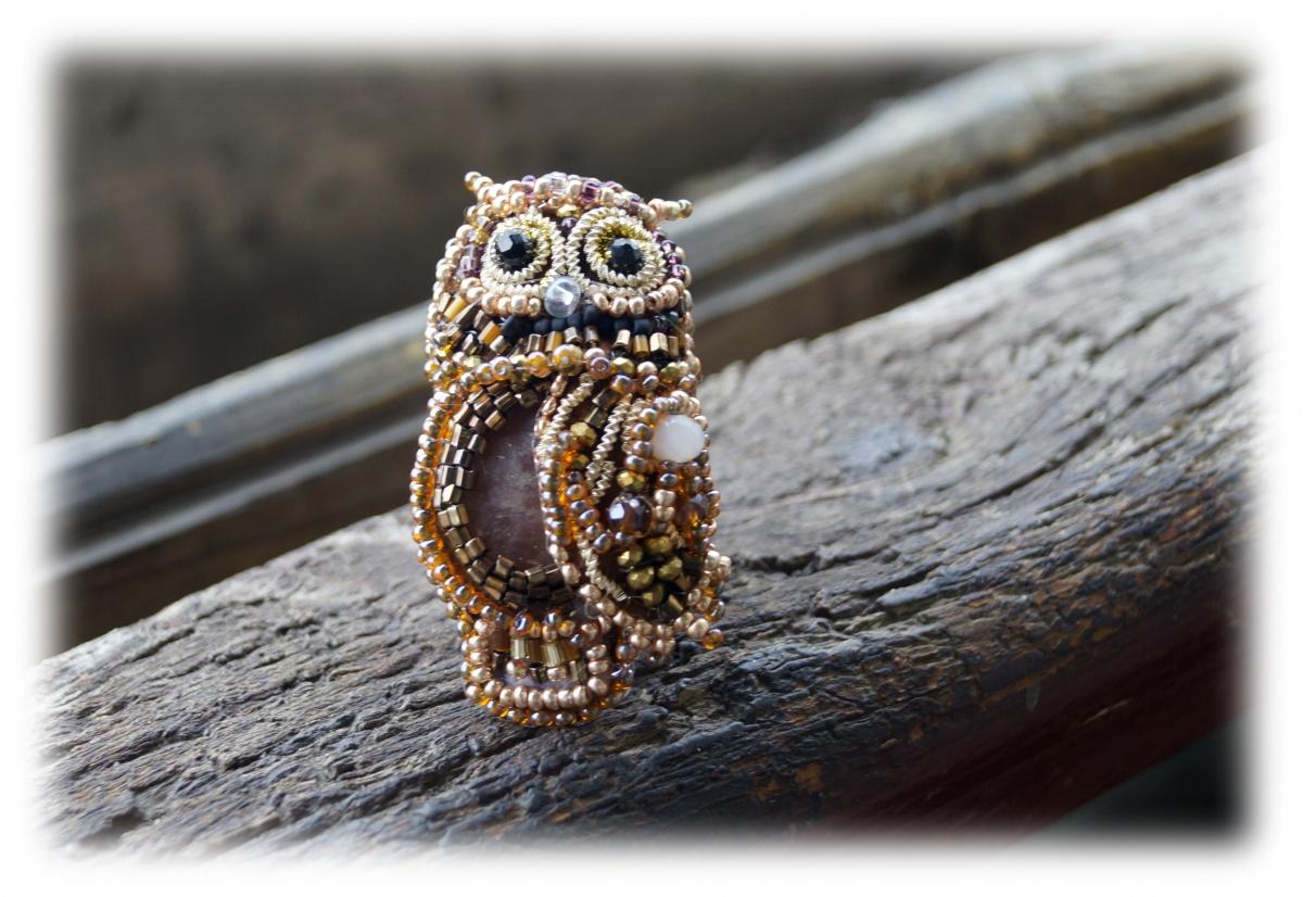 Вот такая мечта орнитолога образовалась, материализовавшись в сову. Вышивка по коже бисером, рубкой, гранеными бусинами и мягкой канителью. Само кольцо тоже сделано из той же натуральной кожи с обработкой края бисером.