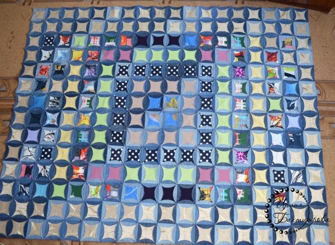 Текст старый. «Копила старые джинсы долго. Потом долго вырезалось, приклеивалось, сшивалось… Жаль не сфоткала стопку джинсов для истории. Шила на кровать, но решила сфоткать на диване, и конечно моя Дуся сразу заинтересовалась. Два раза её сгоняла…