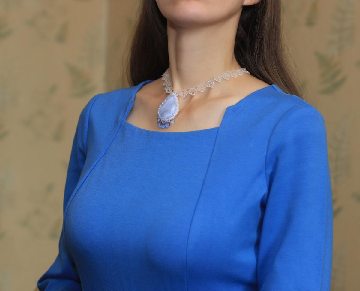 Этот кабошон голубого агата пролежал у меня оплетенным около полугода — не могла придумать, как его подвесить… Пока не увидела у Елизаветы Федоренко похожий камушек такой же формы, подвешенный на половину цепочки Халпенни: Your text to link... Тогда я поняла, что это именно то, что мне нужно