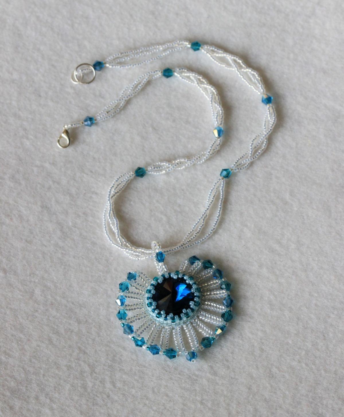 Еще один кулон по мастер-классу Ларисы Чайка13. Мне очень нравится такая форма, давно хотела сделать, но все не было подходящих биконусов к риволи. Риволи заказывала на Али, цвет у него очень красивый сине-зеленый, хотя на моих фотографиях он упорно пытается выглядеть темно-синим