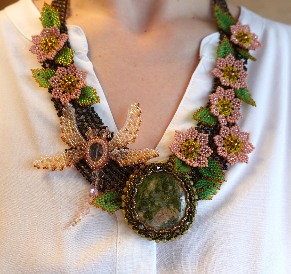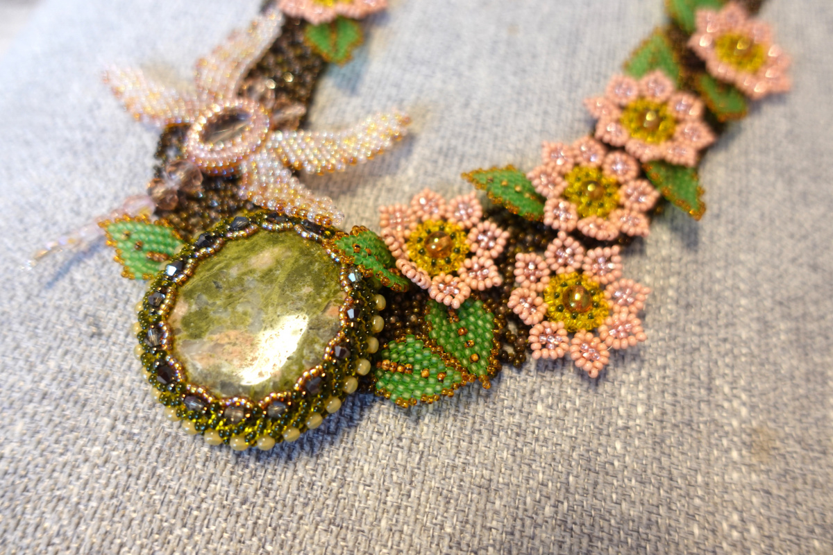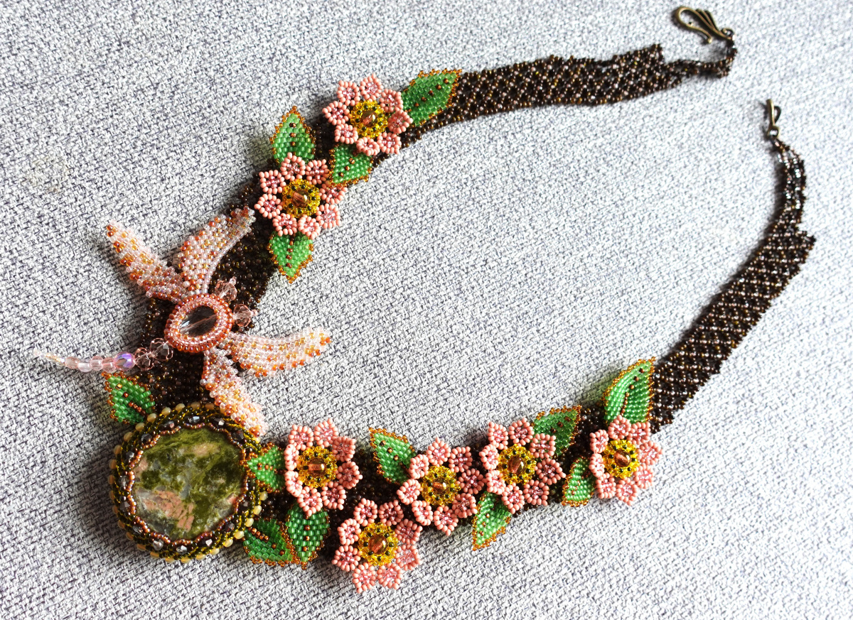 из сделанных работ. Здравствуйте, Бусинки. Камушек большой и тяжеленький, после проб пристроила на сетку. Оплетен петербургской цепочкой, листочки. цветочки и очень хотела бабочку, но стрекоза больше подошла по размеру, Большое спасибо Тамара за идею. Это цветочки